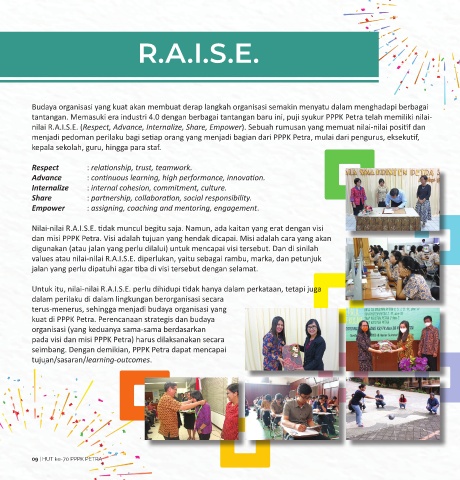 nilai R.A.I.S.E. (Respect, Advance, Internalize, Share, Empower). Sebuah rumusan yang memuat nilai-nilai positif dan