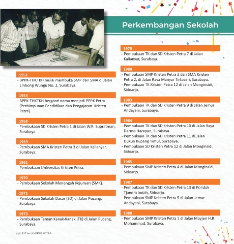 - Pembukaan Taman Kanak-Kanak (TK) di Jalan Pucang, - Pembukaan SMP Kristen Petra 1 di Jalan Mayjen H.R.